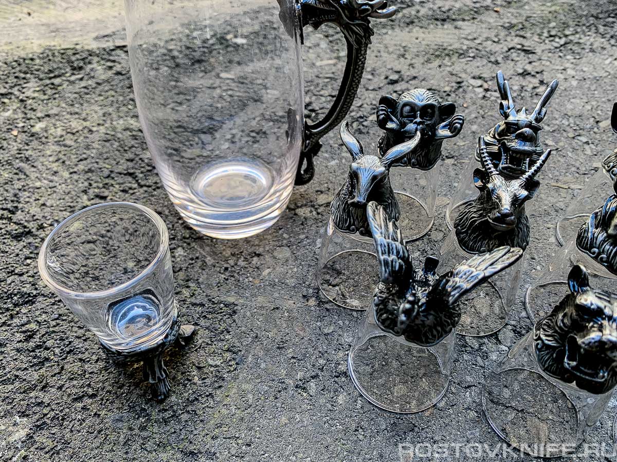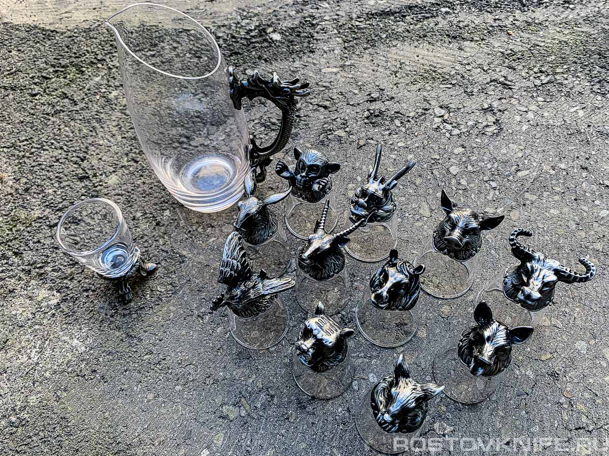 Железные наконечники в виде зверей из восточного знака зодиака придают декоративному набору уникальный стиль. Рюмки 25 мл стекло можно применять не только по назначению, но и в качестве изящного украшения и сувенира.
