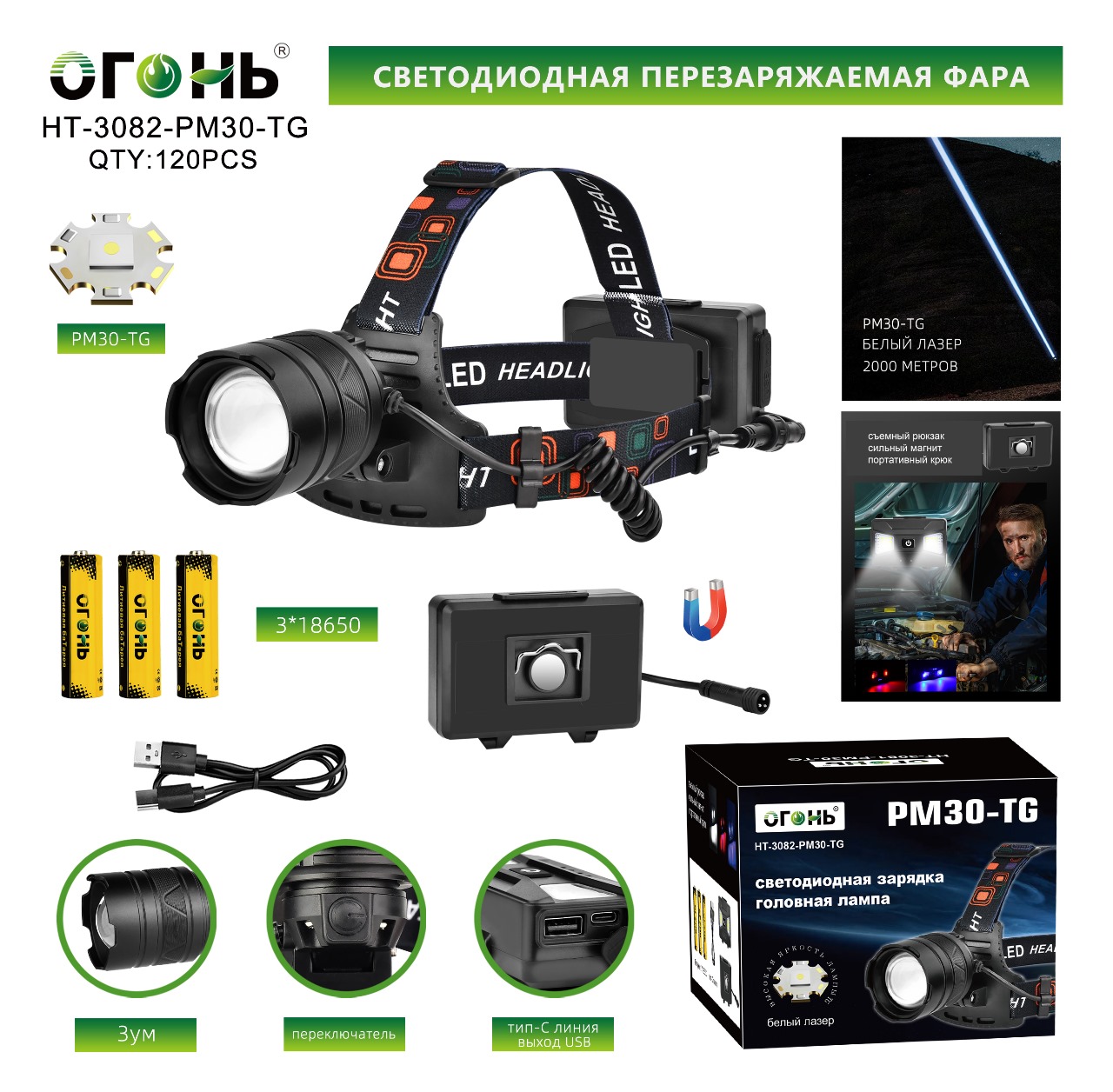 HT-3082-PM30-TG - Фонарь налобный ВКЛ/ВЫКЛ со съёмной кассетницей для аккум., 3х18650