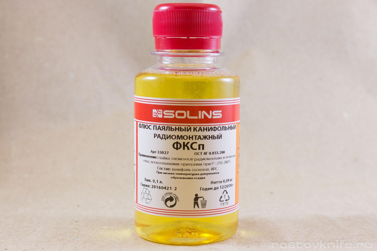 В состав паяльного флюса ФКСп входят канифоль сосновая примерно 20-30%, одноатомный спирт, этиловый или изопропиловый, или смесь в количестве примерно равном 80-70%. Флюс ФКСп не токсичен!