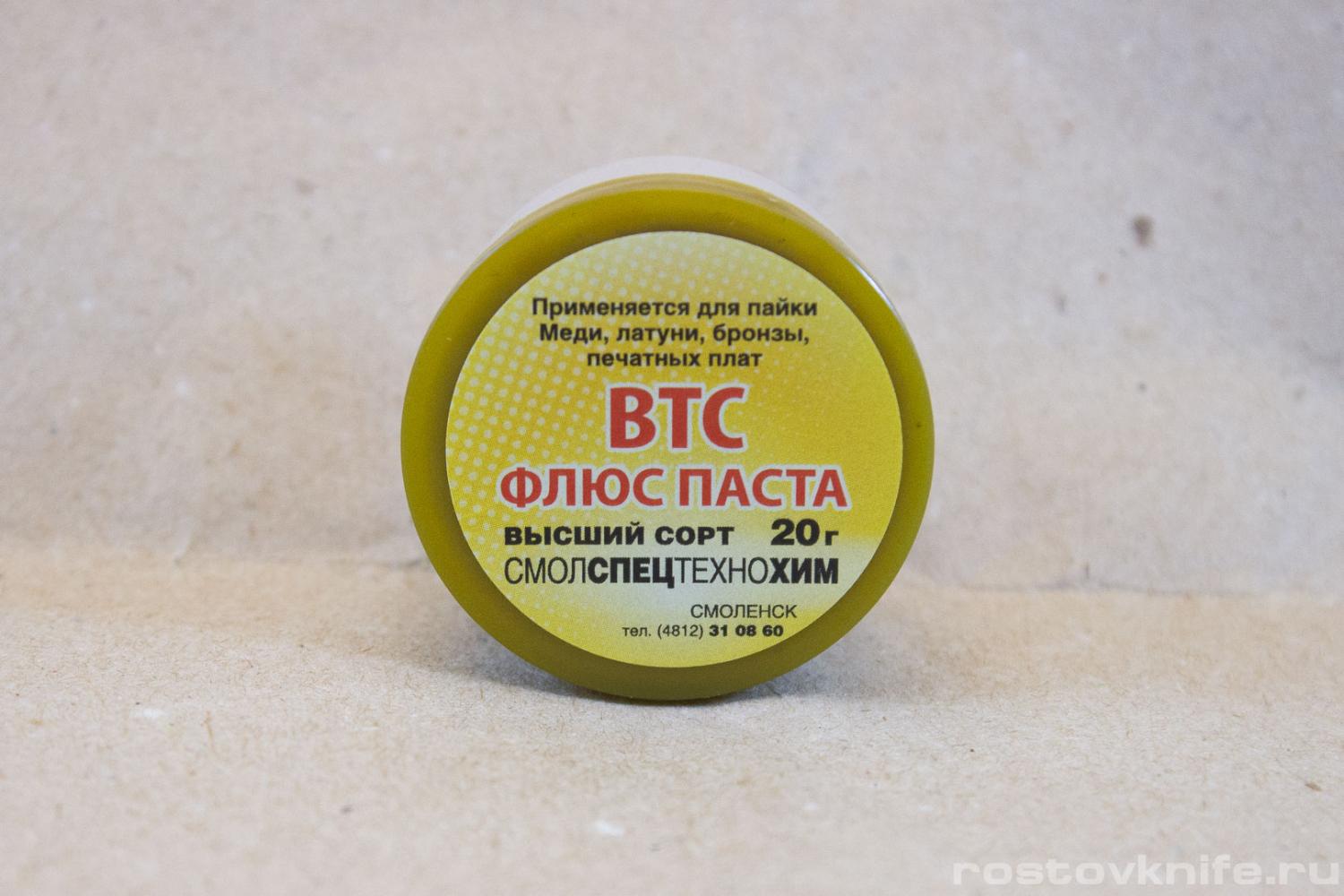 ВТС - активный флюс для пайки меди, серебра, золота и их сплавов. Изготовлен на основе органических кислот, благодаря чему действует в основном на окислы и загрязнения а не на сам металл. Состав: 63% технического вазелина, 6,3% триэтаноламина, 6,3% салициловой кислоты и этилового спирта. Остатки флюса удаляют протиркой детали спиртом или ацетоном.