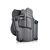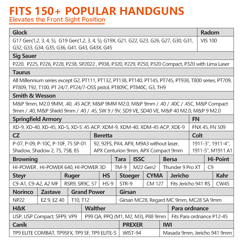 Совместимость: cовместим с 4-дюймовыми и 5-дюймовыми полноразмерным пичтолетом, лучше всего подходит к 4,5-дюймовым, у которого, как и у Glock 17, ствол не длинный и не короткий; Несовместим с субкомпактным или микрокомпактными пистолетами. Нижняя часть кобуры открыта для более длинных стволов, выступающими наружу.