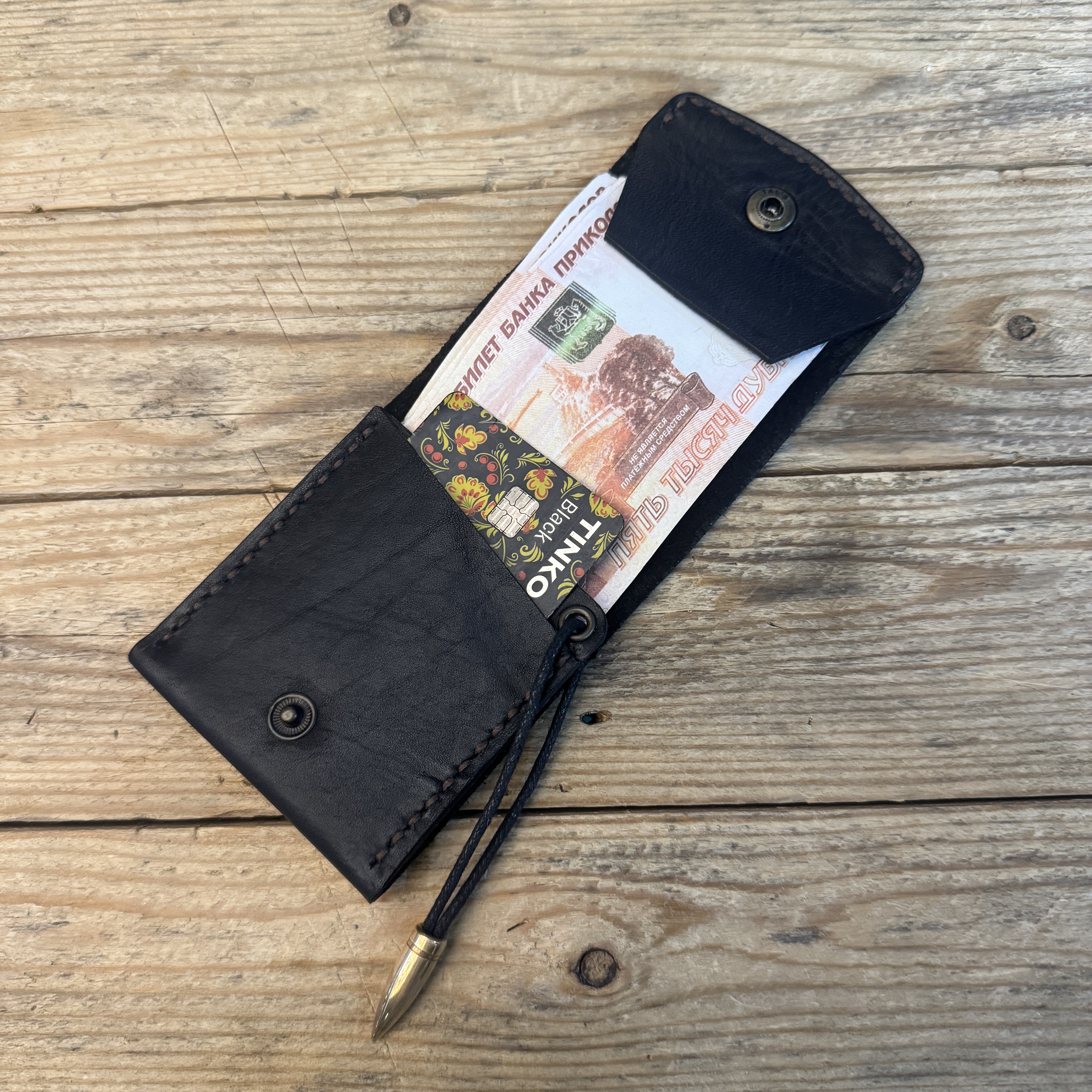 Внутри предусмотрено удобное отделение для купюр и банковских карт, компактное, но вместительное решение для повседневного использования. Особый акцент придаёт декоративный элемент в виде металлической пули, закреплённой на кожаном шнурке, который добавляет изделию характер и индивидуальность.