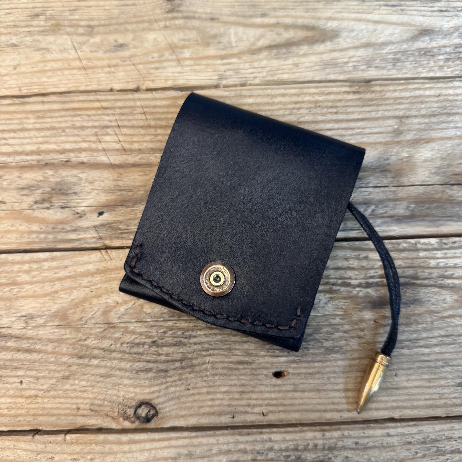 Стильное кожаное портмоне ручной работы, выполненное из гладкой натуральной кожи глубокого тёмного оттенка. Лаконичный и брутальный дизайн подчёркивается аккуратной прошивкой по краям и металлической кнопкой-застёжкой в виде гильзы, обеспечивающей надёжное закрытие.