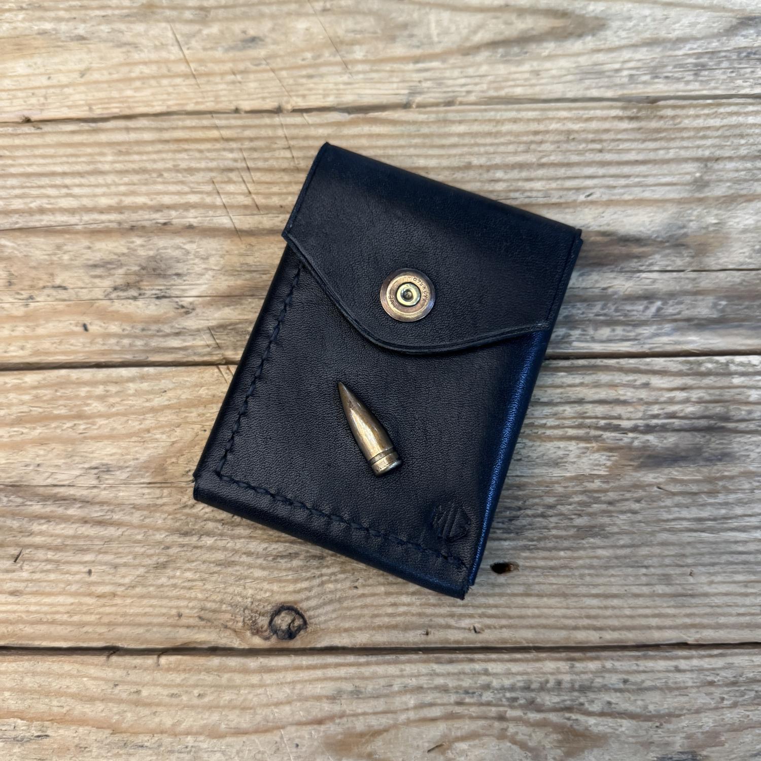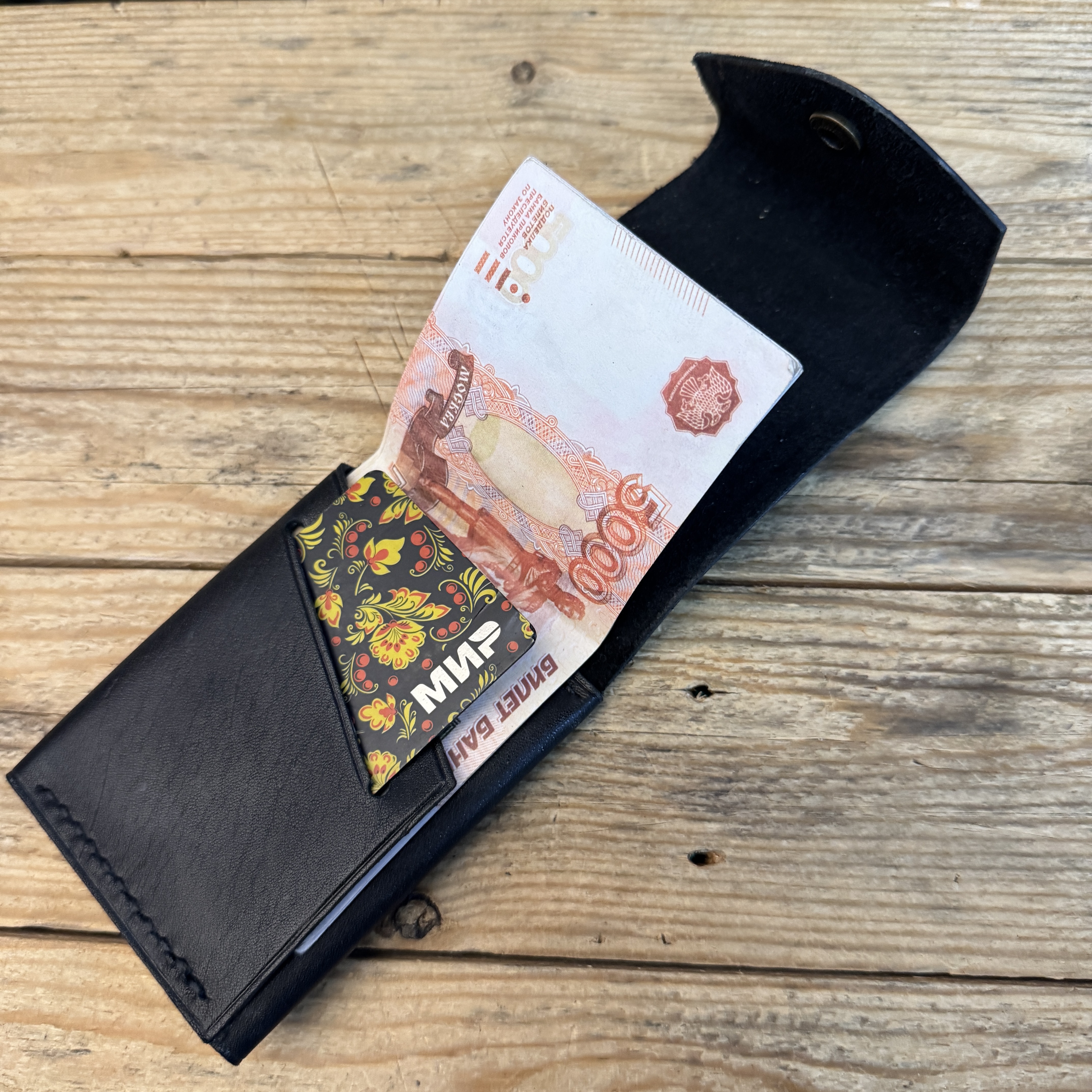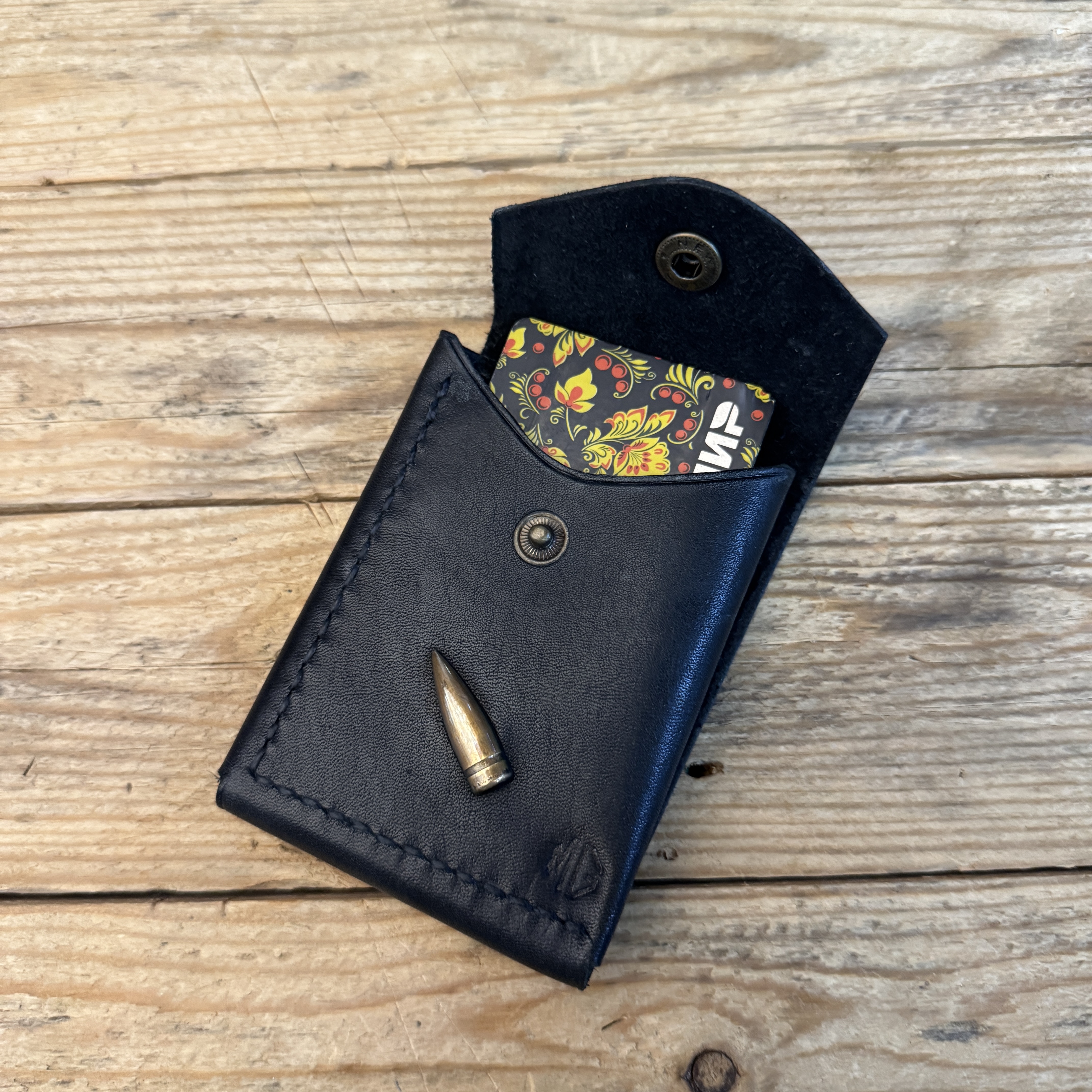 омпактное кожаное портмоне ручной работы, выполненное из натуральной кожи глубокого чёрного цвета с лёгким матовым блеском. Модель отличается лаконичным и брутальным дизайном: аккуратная прошивка по периметру подчёркивает форму, а клапан с металлической кнопкой в виде гильзы надёжно фиксирует содержимое.