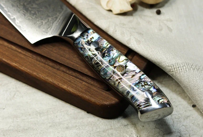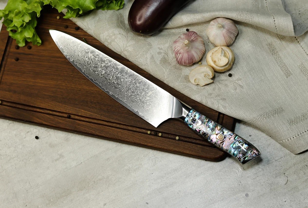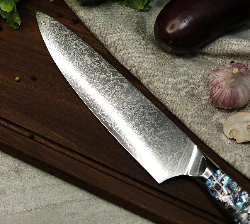D-84 - Нож шеф перламутр/акрил/пин 210мм, 10Cr15MoV/ Damascus laminated