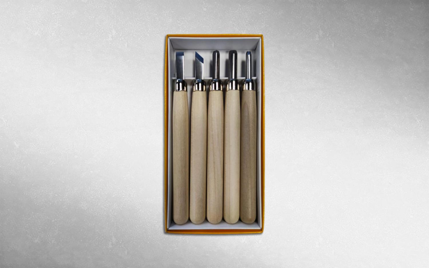 Набор из пяти резцов для резьбы по дереву с клинками из стали SK-5 и рукоятями из магнолии.