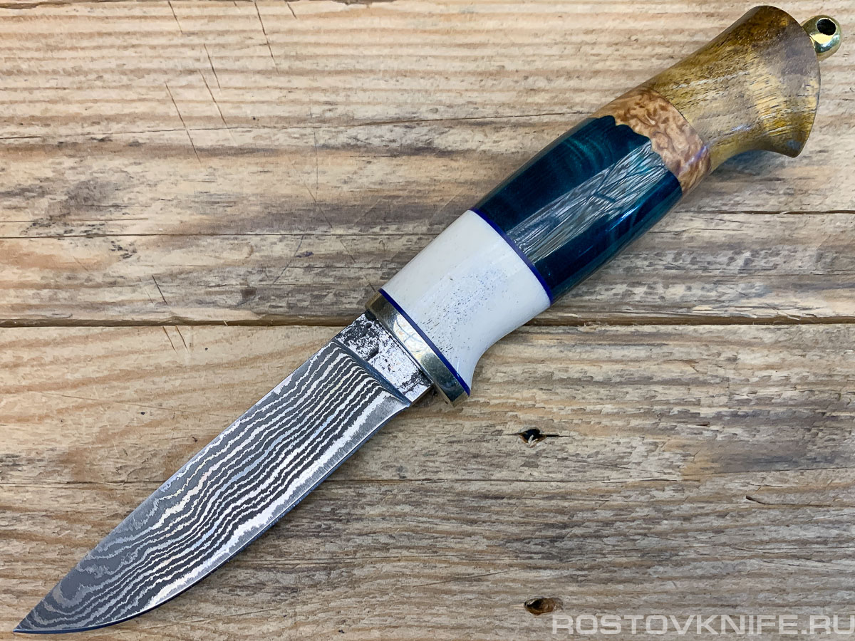 Материал рукояти: Рог, акрил, стабилизированная карельская берёза, латунь