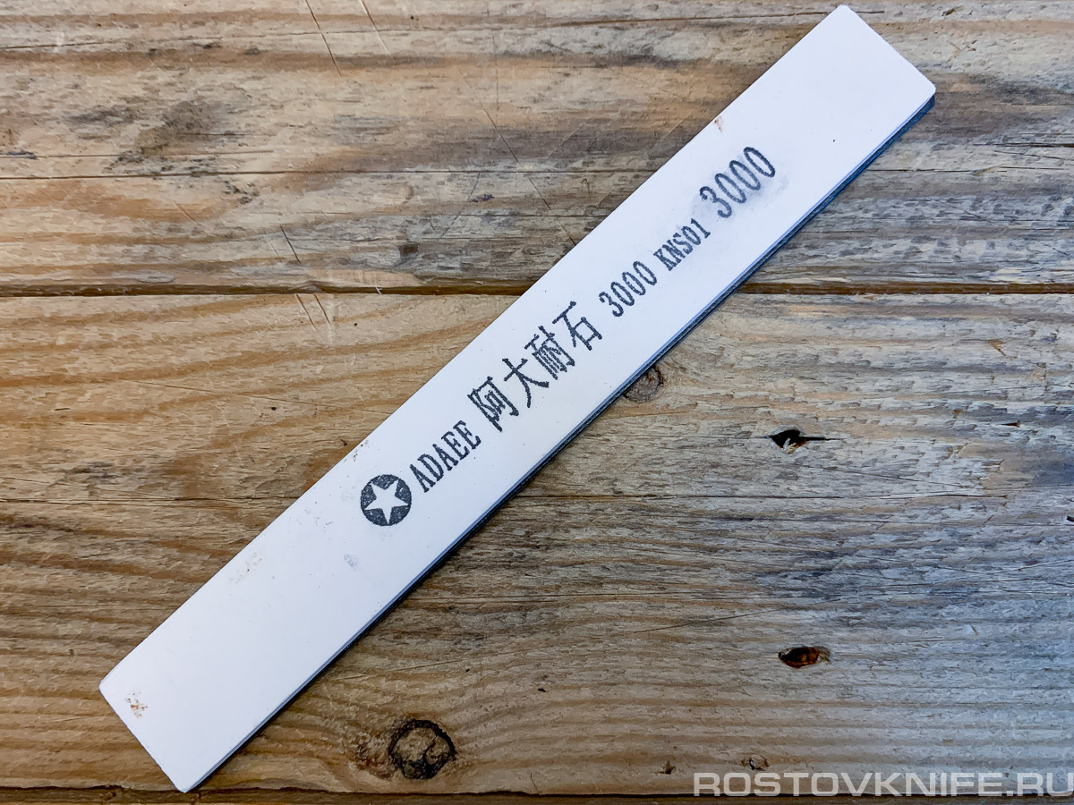 Чтобы режущая кромка была максимально гладкой, а соответственно — острой, на завершающем этапе затачивания, следует использовать шлифовальный точильный камень. Adaee 3000 с гритностью 3000 частиц на каждый квадратный сантиметр как раз относится к этой категории. Камень расположен на подложке из крепкого пластика, размер которой составляет 15,7х2,2 см. Его можно легко установить на основании наиболее популярных моделей точильных станков Ganzo или же Apex. Но камень вполне может использоваться и в качестве полноценного инструмента в бытовых или же профессиональных нуждах. Хотя поверхность Аdaee 3000 довольно гладкая, во избежание ее засаливания, перед началом работ камень лучше смочить водой, а по окончании вытереть или промыть.
