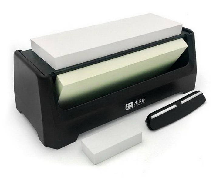 В комплект входит пластиковая противоскользящая подставка для камней, направляющая для заточки ножей и небольшой выравнивающий камень.